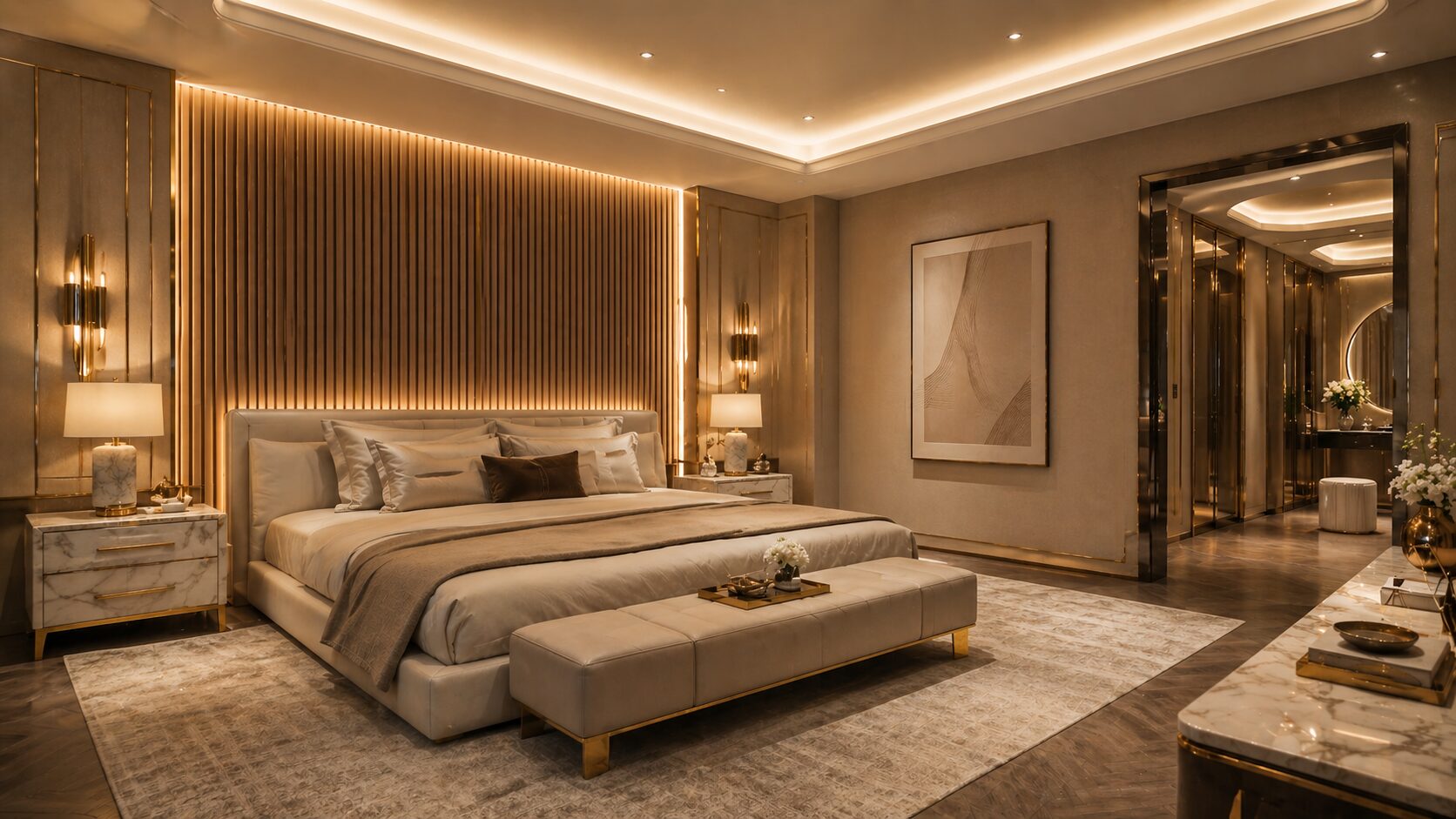 “Luxury modern bedroom, beige and gold color palette, wooden fluted panel headboard wall with integrated warm LED backlighting (3000K), upholstered king bed, marble side tables, soft indirect cove lighting ceiling, ambient + accent lighting layers, ultra realistic 4K render, cinematic lighting, wide angle lens”