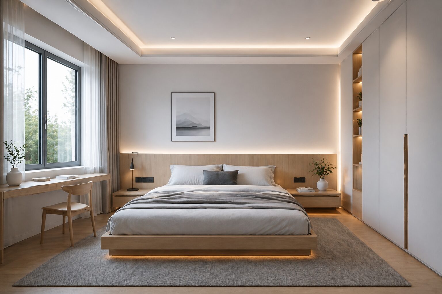 “Minimal bedroom design, Scandinavian style, white, grey and light oak palette, clean furniture lines, hidden LED strip lighting in ceiling and bed back panel, soft daylight from window, clutter-free environment, realistic interior render, soft shadows”
