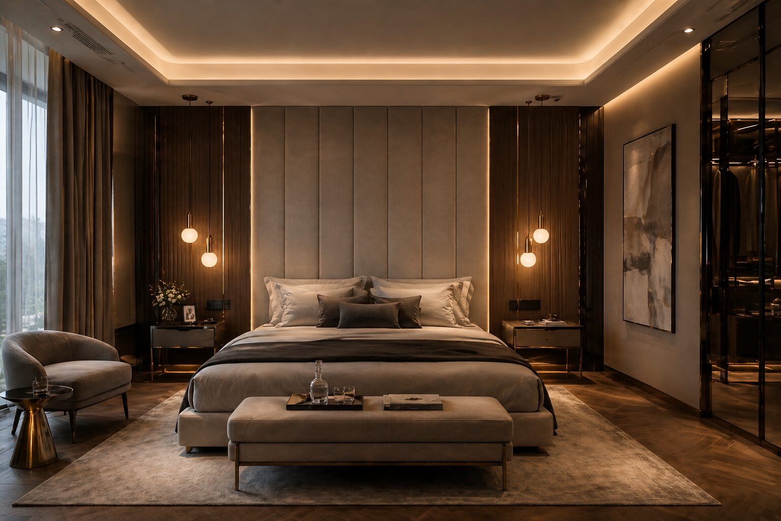 “Luxury hotel bedroom interior, padded headboard wall, warm cove lighting ceiling, pendant bedside lights, dark wood panels, soft fabric upholstery, layered lighting (ambient + task), cinematic mood lighting, ultra realistic 4K render”