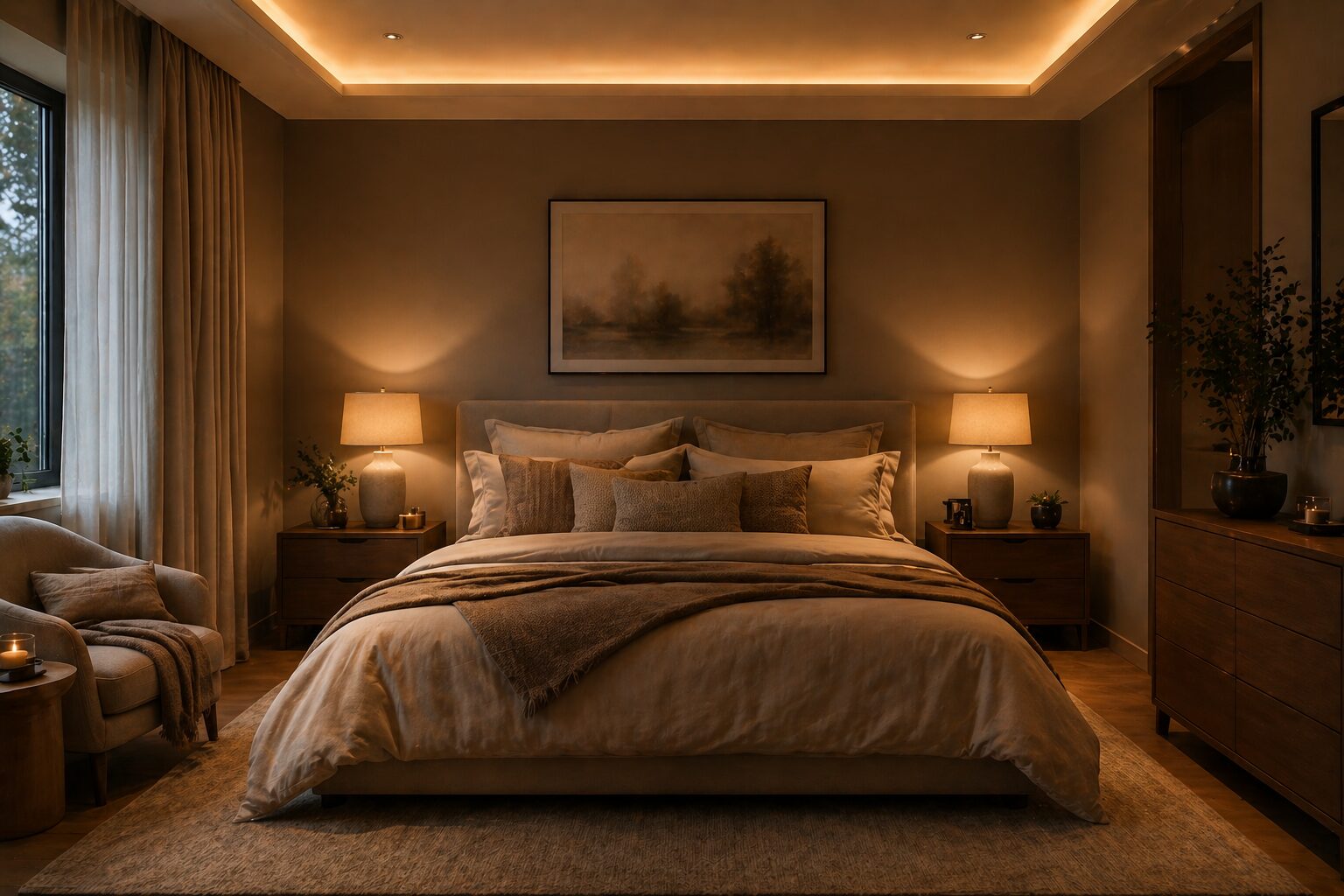 “Cozy bedroom interior, warm earthy tones, fabric textures, soft bedside lamps, indirect warm lighting (3000K), layered ambient lighting, relaxing mood, realistic lighting simulation, depth of field”