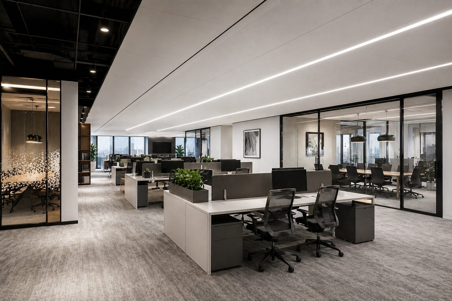 “Modern corporate office interior, open workspace layout, linear LED ceiling lights, glass partitions, neutral color palette (white, grey, black), ergonomic furniture, clean professional design, realistic 3D render”