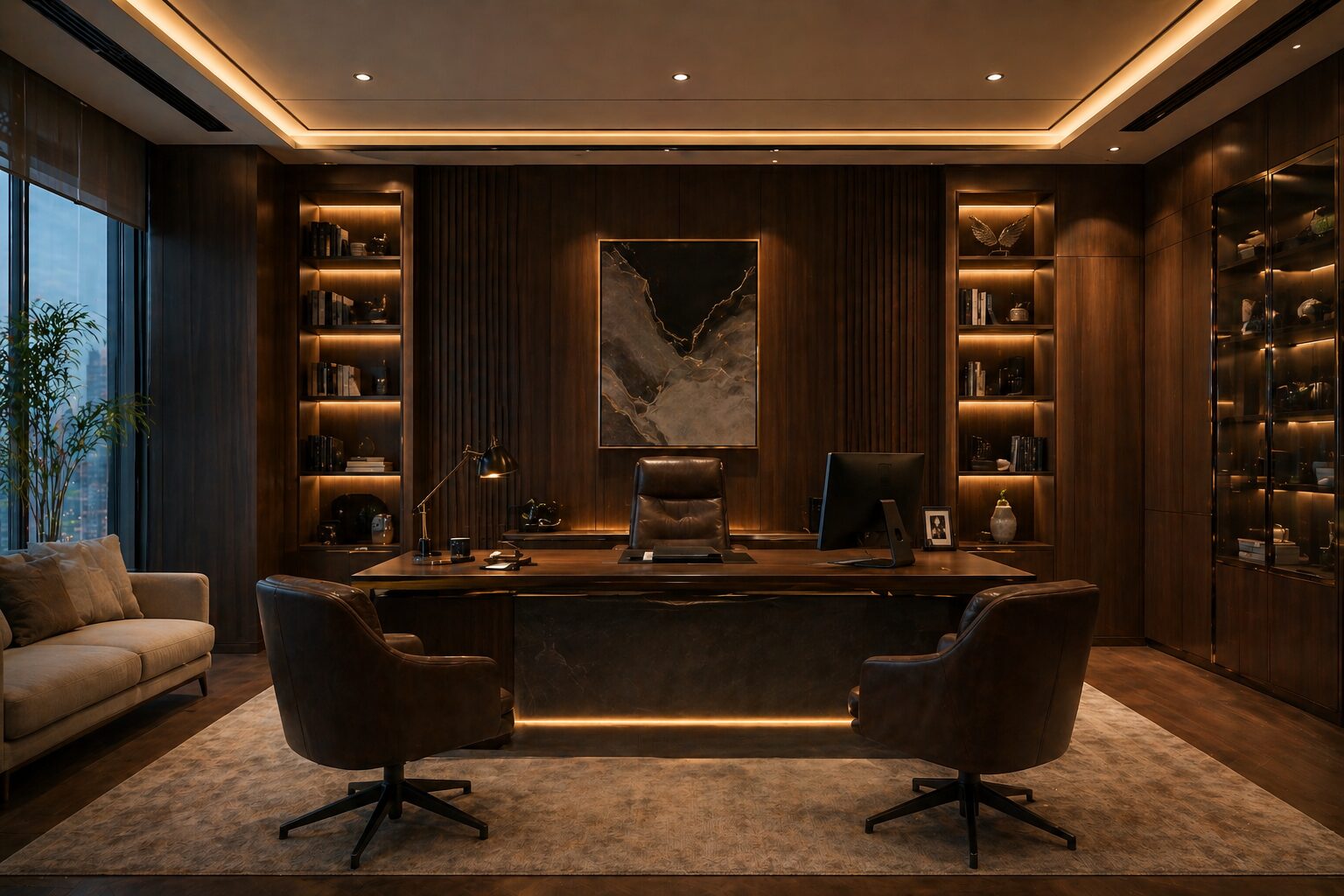 “Executive office cabin, dark wood panel walls, warm indirect lighting (3000K), premium desk setup, leather chair, ambient lighting with hidden LED strips, luxury corporate interior, cinematic render”