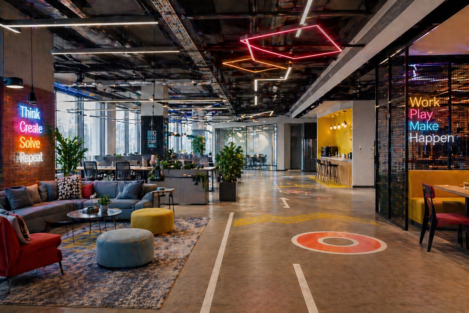 “Creative startup office, vibrant color palette, breakout zones, neon accent lighting, open seating, modern furniture, energetic and dynamic workspace, realistic interior render”