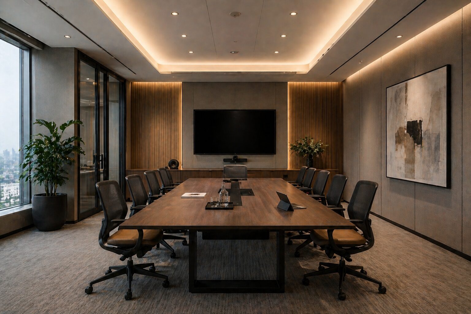 “Modern conference room, large meeting table, acoustic wall panels, soft indirect ceiling lighting, minimal design, professional atmosphere, realistic lighting simulation”