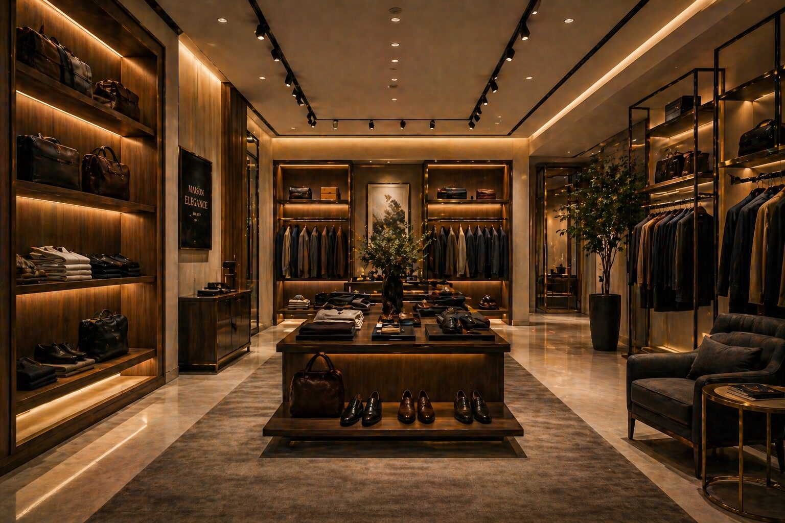 “Luxury clothing showroom, warm lighting (3000K), wooden shelves, soft ambient lighting, elegant display racks, premium retail interior, realistic render”