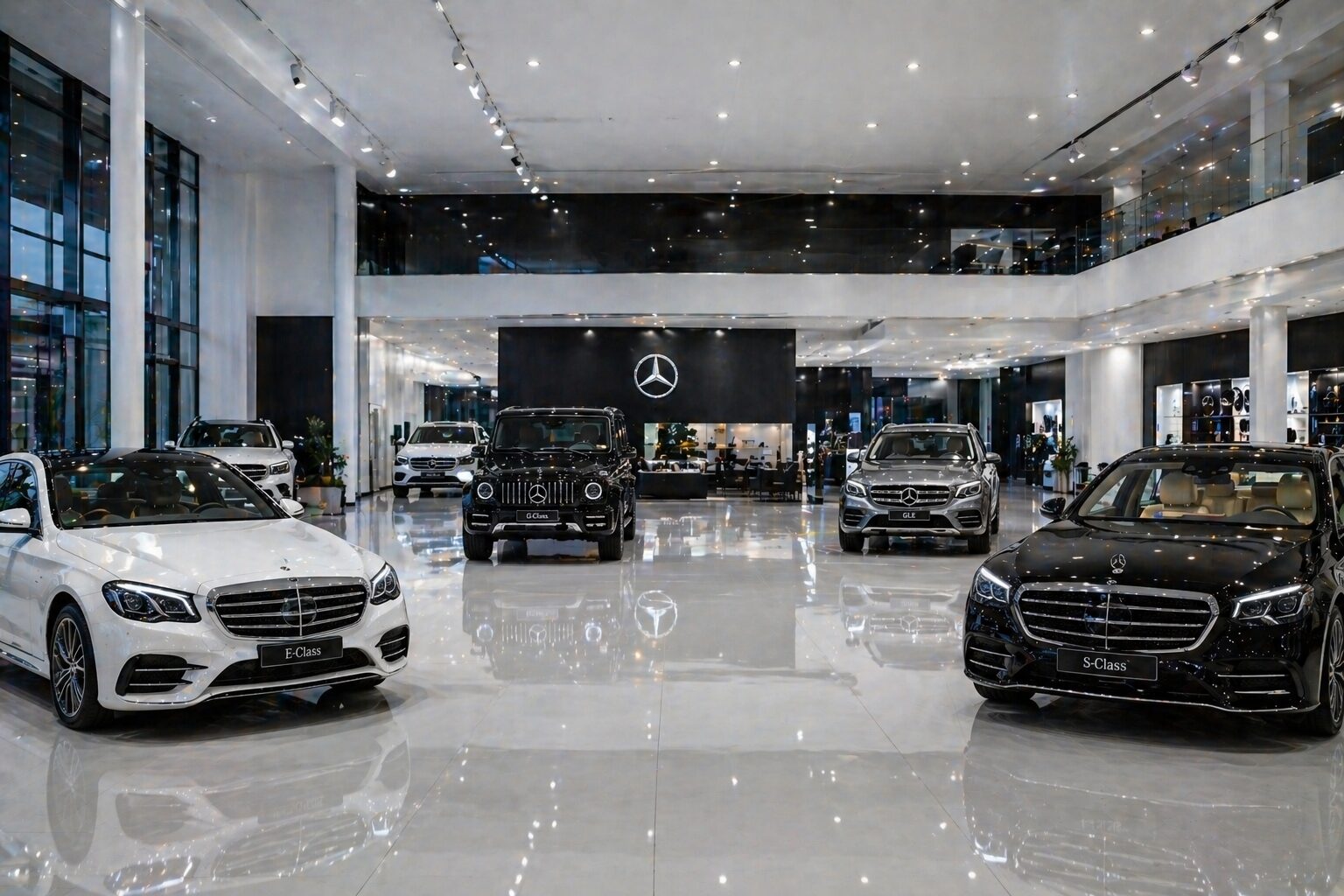 “Modern car showroom interior, glossy reflective floor, bright white lighting (4000K–5000K), dramatic spotlights on cars, large open space, ultra realistic render”